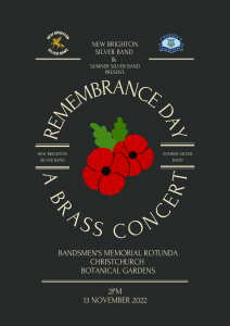 On Sunday 13th November, we combined with our neighbouring Sumner Silver Band and presented a Remembrance Day Concert at the Bandsmen Memorial Bandstand in the Christchurch Botanical Gardens. A band of over forty strong presented a programme that recognized the very special significance of Remembrance Day and included a tribute to those Bandsmen to whom the Rotunda has been dedicated. Many of these men started their playing careers with Sumner and New Brighton Bands.